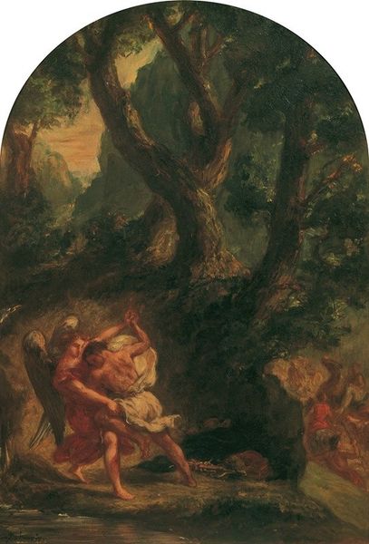 Eugène Delacroix painted "Jacob's Fight with the Angel" at Saint-Sulpice in Paris. The central motif, a wrestling match between man and angel, carries profound symbolic weight. Jacob, struggling with a divine messenger, embodies the human struggle with destiny and the search for spiritual understanding. The image of conflict, of bodies intertwined, is an ancient one, resurfacing in different guises across cultures. From classical depictions of wrestling gods to Renaissance portrayals of struggle, it signifies a pivotal moment of transformation. This physical encounter speaks to the psychological battle within Jacob, mirroring our own internal conflicts. Think of the angel's touch, a symbol of divine intervention, a moment of crisis and change. It recalls similar moments in art history where a touch or gesture signifies a profound shift in fate. This image evokes a deep, subconscious response, reminding us of our own struggles. This timeless narrative of struggle and transformation resurfaces through art, resonating with the viewer.