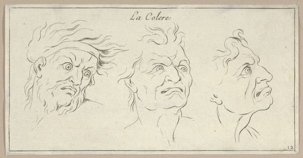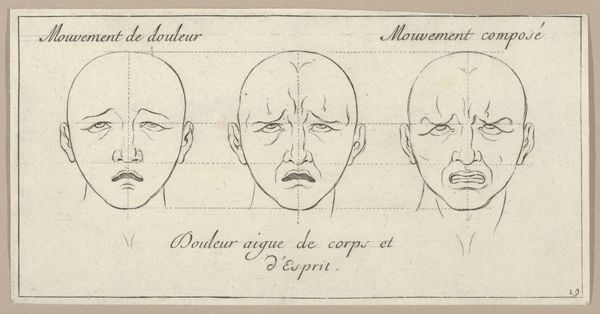 Sébastien Le Clerc the Younger made this print, "Le Pleurer and mouvement composé," using engraving techniques. This was a period when printmaking served both artistic and commercial purposes. The lines you see were etched into a metal plate, likely copper, with tools called burins and needles. This painstaking process allowed for precise, repeatable images. The quality of the line is crucial here – thin, controlled strokes that capture the nuances of facial expression. It is amazing how much expression an artist can convey with such minimal means! These prints were often made in multiples, a crucial element in the work's social context. In the 17th and 18th centuries, prints like this were widely disseminated, serving as educational tools for artists or as decorative pieces. The labor involved in creating the plate was multiplied through each impression, making art more accessible. Understanding the printmaking process highlights the democratizing potential of art. It reminds us that the value of an image lies not only in its aesthetic qualities but also in its accessibility and the labor that went into its creation.