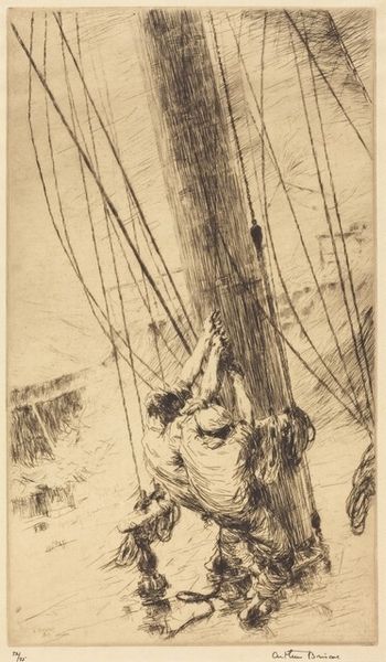 Editor: "Rough Going," an etching and engraving from 1919 by Kerr Eby. It looks…well, pretty rough! The dark, scratchy lines give it a sense of struggle, of beasts and men just trying to make their way through something awful. What stands out to you most about this piece? Curator: It pulls me in, doesn’t it? Those lines you mention—they vibrate with tension. It's like looking at a memory, slightly out of focus, the important bits seared into the mind. And it makes you wonder what 'rough going' *really* means here, doesn’t it? It’s about the physical mud, yes, but it’s so much more. Editor: In what way? I'm seeing the war context from the date. Curator: Precisely! Eby was a war artist. These men, these horses, they’re not just moving supplies. They're carrying the weight of a world at war. See how the lines in the foreground almost claw at the viewer? That's the clinging mud, but also, I think, the clinging trauma. Did you notice that skeletal trees are looming in the midground and background? They are not particularly obvious as one focuses on the foregrounded action. Editor: I didn’t! So, the landscape itself is almost a character? Curator: Absolutely. It’s a silent witness, a testament to devastation. And Eby doesn’t give us any grand heroics. Just the grim determination to keep moving, one step at a time. And consider how Eby manages to generate the drama in a near monochrome palette with subtle, yet highly evocative, use of shading. I always feel an existential resonance when I view this work. Do you find that interesting, as a counterpoint to any narrative interpretations? Editor: Definitely! I initially just saw the surface-level image, but now I appreciate the deeper layers of meaning embedded in the composition itself. Curator: Isn't it incredible how a few lines can speak volumes? Editor: Totally. I see the "rough going" now on so many levels!