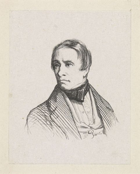 Curator: I find something immediately striking about this piece—perhaps it's the stern gaze or the formality of dress, but there's an undeniable sense of authority emanating from this portrait. Editor: Yes, this is "Portret van Leendert de Koningh", an engraving made sometime between 1832 and 1900 by Adolphe Frédéric Nett, currently residing here at the Rijksmuseum. Consider how the meticulous hatching builds both form and an austere atmosphere. Curator: Austere is exactly the word! It’s like a visual embodiment of 19th-century patriarchal power structures. The sharp lines, the rigid posture… it speaks volumes about the sitter’s position within a highly stratified society. I can imagine the social expectations weighing heavily on him. Editor: Indeed, the engraving's presence within the Rijksmuseum collection adds another layer. It solidifies the historical narrative surrounding individuals who held positions of influence, reflecting and reinforcing a certain vision of Dutch identity through its selection and display practices. How do we, as an institution, grapple with these potentially exclusionary legacies today? Curator: That's precisely what makes art history so compelling; it's a conversation, not a lecture. Here we see this very specific portrayal, Leendert de Koningh, whoever he might have been, becomes a stand-in for all the structures, limitations, and assumptions of his time. We must remember those left outside the frame as well. Editor: And let's also remember that this is an engraving—a readily reproducible medium, compared to, say, a unique painted portrait. Engravings like these served to disseminate power, spreading these carefully crafted images of authority far and wide within society. This adds a socio-political dimension, certainly. Curator: Absolutely. We have to acknowledge that art doesn't exist in a vacuum, especially portraiture. Considering the period of creation for this print, what ideologies might have influenced both the artist and subject? What roles do class and gender play here? Editor: So, beyond its aesthetic qualities, it’s an artifact of power and dissemination of image within a complex, specific, historical and cultural matrix. Looking at this engraving then urges us to ask crucial questions about representation, historical narratives, and our institutional responsibilities. Curator: Agreed. It's more than just a face; it’s a reflection—a stark reminder of the intricate interplay between art, society, and the narratives we choose to perpetuate.