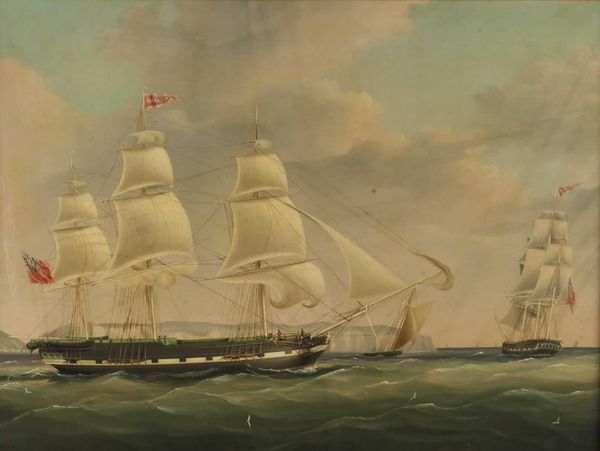 Editor: Here we have James Guy Evans’s "The Tow Boat Conqueror" from 1852. It’s an oil painting, and seeing these large ships dominating the water makes me think about the power of industrialization. What stands out to you when you look at this painting? Curator: It's interesting to consider the labor involved in both its subject and its creation. These aren't just ships; they're embodiments of expanding trade routes and resource extraction. Oil paint itself, as a manufactured substance, represents a shift in artistic production—a departure from earlier, more ‘natural’ pigments, facilitated by industrialized processes. Editor: So you're less focused on the romantic view of ships and more on what made them *possible*? The materials and the labor that went into the ships and even the painting? Curator: Precisely. Consider the human cost involved in constructing and operating these vessels. The materials sourced, the conditions of labor, and the eventual consumption of the goods transported - all are embedded in this image. Even the realism adopted for the work relates to social themes and everyday life. How might this ‘realistic’ depiction conceal other realities concerning labour practices during that era? Editor: That makes me look at the ships differently. I initially saw grand vessels, but now I can’t help but wonder about the workers and the origins of everything that went into their making. The ships become these containers of a larger history. Curator: Exactly! Thinking about the social context gives a rich vision to the themes. The materiality of both the ship and painting become linked, no? This gives a clearer perception about how paintings served to immortalize, but also hide, certain social relationships related to the world of manufacture and power. Editor: I never considered analyzing a painting in that way before! Thanks to you, I understand to read a lot beyond its beauty now.