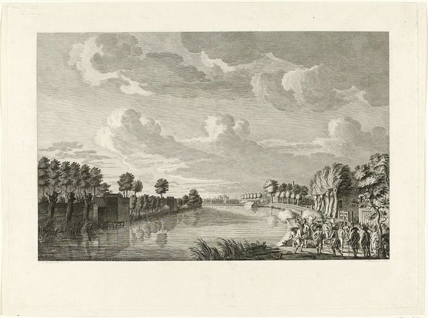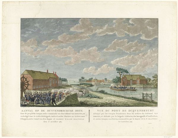 Cornelis Brouwer produced this print in 1787, depicting the ‘Attack at Ouderkerk on the Amstel near the Binnen-Bullewijk’. It's an image that connects directly to the turbulent political climate of the Dutch Republic in the late 18th century. The print visualizes an armed conflict between Patriot and Orangist factions. The Patriots, who sought democratic reforms, are shown attacking a position held by Orangist forces loyal to the Stadtholder. Through its detailed depiction of the battle, the print provides a window into the political and social divisions that characterized Dutch society at the time. To fully understand this artwork, we can consult period newspapers, pamphlets, and political tracts. These resources shed light on the key players, the ideologies at stake, and the broader context of political upheaval in the Netherlands during this era. Art like this reminds us that its meaning is always shaped by social and institutional contexts.