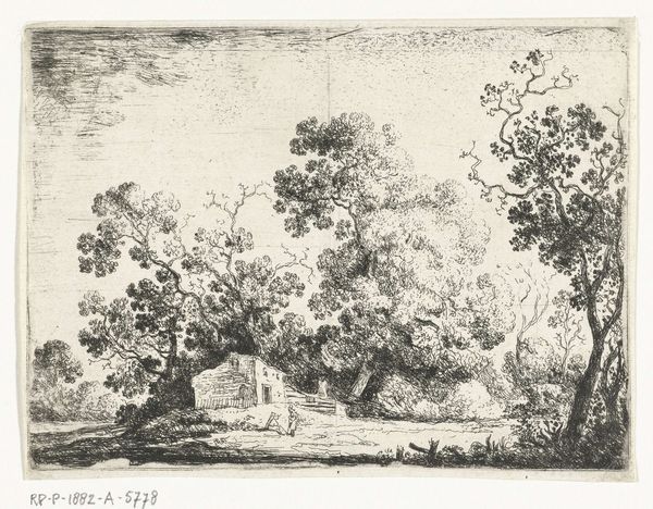 Curator: Here we have Adrianus van Everdingen’s “Landschap met wilgen,” dating from sometime between 1842 and 1888. It's rendered in ink, likely using an etching technique. Editor: My first impression is one of intimacy, despite the grand subject matter of a landscape. The tight, interwoven lines create a certain depth, but it feels contained, almost secretive. Curator: Well, consider the willow. In many cultures, they symbolize mourning, loss, but also resilience, new beginnings from sorrow. They occupy this almost paradoxical space in the collective imagination. Editor: Paradox is key, I think. Look how much ink is used here. It looks like Van Everdingen really worked and reworked the metal plate to achieve these layered, dense clusters of lines. Did he use soft ground etching combined with drypoint to build this image? Curator: Likely so! The technique becomes integral to the expression. Think of how etching, as a process, echoes the landscape itself. It's subtractive but ultimately additive, eroding the plate, building up the image in darkness. Is the work almost meditative, in a way? Editor: In a material sense, absolutely. The resist had to be applied, lines etched, and then re-etched to vary their depth. Each stage carries weight, influencing the final outcome. There are many possibilities, and his decisions carry through the centuries. Curator: Yes, there’s the personal weight of memory inscribed in those marks, but also a deeper current—of human interaction with nature. The willow is more than a tree. It embodies a story of grief, transformation, a quiet insistence of life even in the face of adversity. Editor: Right. The availability and the relative affordability of the tools, the development of inks, etching plates, and printing presses, they all played their part, expanding printmaking in the nineteenth century. Did the industrialization of agriculture play any part, like a contrast to what it replaced? Curator: Absolutely. These artworks offered views into nature that were slowly vanishing and a window into the soul. It offers a compelling perspective on a time of huge transitions in European life. Editor: I will remember this little meditation on time and change! Curator: An exquisite glimpse into both loss and enduring strength, materialized through a meticulous craft.