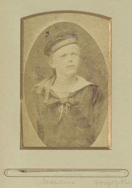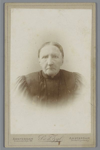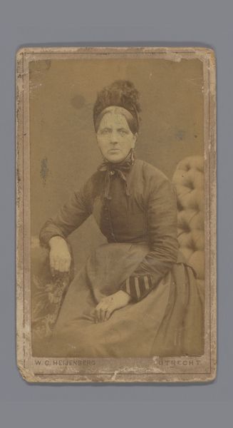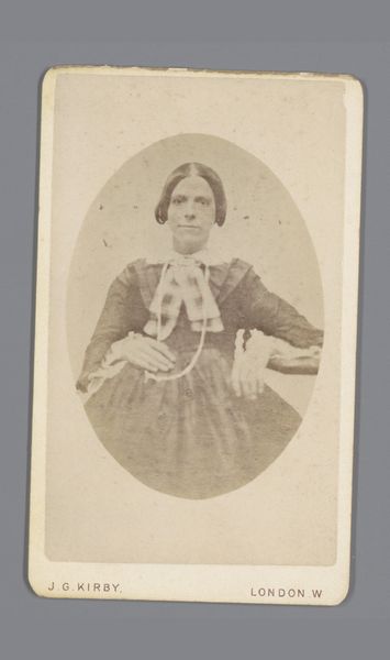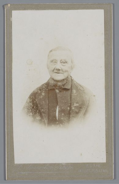 Curator: There's something so compelling about the direct gaze in this portrait. It’s entitled "Portret van een onbekende oude vrouw met hoofddeksel" – that's "Portrait of an unknown old woman with a headdress" – a gelatin-silver print attributed to J. van Os, made sometime between 1855 and 1885. Editor: Immediately, the high contrast in the image speaks to me. It throws that amazing cap she's wearing into stark relief and creates a somewhat theatrical air, despite her somber expression. The oval vignette only intensifies this impression of stepping into a memory, a dream. Curator: Precisely. Consider the symbolic weight of these portrait practices in the mid-19th century. Photography was beginning to democratize image-making, yet these formal portraits were still highly structured and presented a constructed persona to the world. The woman's clothing and headdress tell a story about her social standing and regional identity. Editor: Absolutely. The stark realism suggests an embrace of modern, supposedly 'objective', aesthetics in visualizing common women of the era. The portrait isn’t trying to beautify its subject, but to preserve and document her—revealing perhaps a certain progressive stance taken by the artist? I wonder about the sitter, whether this portrait was commissioned, perhaps even posthumously to preserve a familial memory? Curator: It's fascinating how such an apparently simple image carries so many potential cultural layers. Her clothing could signify modesty, and piety, but also practicality. How much did she collaborate in the composition? Were photographs used by political authorities to create catalogs and shape new perspectives of identity? And, for me, the cultural echo of images like this is so relevant to the contemporary focus on personal branding and construction of public image through photography. Editor: Ultimately, I am struck by how timeless it seems. While the headdress and format anchor it to a particular period, the woman's face—her unwavering gaze, the strength etched in her features—speaks across generations. Curator: Indeed, it reveals how visual representation connects with identity in complex ways over the long stretches of time.