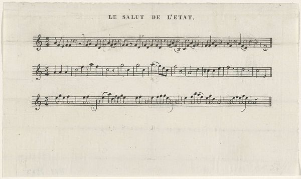Curator: Let’s discuss "Bladmuziek Tab. VII," an engraving by an anonymous artist dating back to 1743. What are your initial thoughts on the piece? Editor: The detail is amazing for such a small, aged thing! Looking closely at this music sheet gives me an intense feeling of order…almost regimented, but the tiny handwritten annotations betray its true nature of craft. I wonder what purpose it originally served? Curator: Notice how the precise engraving emphasizes clarity. The anonymous creator employed stark lines, devoid of extraneous embellishment. The interplay of horizontals forming the staves against the vertical note stems produces a structured visual field. Observe the neat calligraphy adding another layer. Editor: Yes, I'm immediately drawn to the lines that make the staves, precisely etched with tiny deviations and inconsistencies if you look closely. This creates such an impression about process. Engravings such as this weren’t just the pursuit of the highly educated but represented manual skills and meticulous labor. Were these intended for didactic purposes, or perhaps amateur practice? Curator: The visual structure certainly evokes pedagogy. Consider the layout, divided into discrete sections, each presenting a variation or exercise. The systematic arrangement promotes understanding musical form. Even the contrasting tempos "Adagio" and "Allegro" imply musical exercises or studies of these baroque conventions. Editor: So you're seeing an exploration of how something is structured. But I am interested in this relationship to a wider practice, these lines denote not only the visual representation of notation but physical craft, demanding dexterity and sustained attention in this laborious process. This sheet bridges the refined, formal realm of composition with tangible practice. What kind of access was required to make pieces like these? Curator: Your focus certainly draws attention to material conditions shaping its aesthetic. Thinking about semiotics and its context might provide a more full appreciation for the musical thinking prevalent at the time. Editor: Perhaps together we can explore how material means interact with those more purely formal goals. The tension produces unique avenues for exploration. Curator: An appropriate summation, indeed! Let us move on to our next object now with broadened perspective.