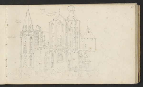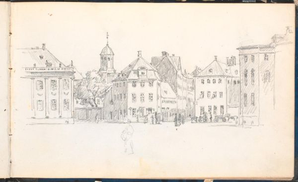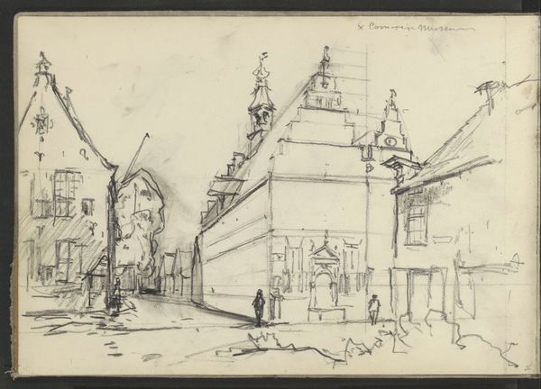 Curator: This is Thomas Girtin’s delicate pencil drawing, "Glasgow: Looking along High Street towards the Cathedral." Editor: There's a sense of quiet observation here, despite the bustling city it depicts. The lightness almost feels ghostlike. Curator: Girtin, though often overshadowed, was a contemporary of Turner. Looking at this, we can see the social and cultural values embedded in the depiction of urban life and religious architecture. The cathedral dominating the skyline represents the enduring power of the church, while the buildings around it hint at everyday life. Editor: I'm drawn to the texture he creates with such simple lines. You can almost feel the rough stone of the cathedral versus the smoother surfaces of the domestic buildings. What materials were available, and how did the city’s growth rely on them? Curator: It's interesting how the drawing becomes a document reflecting the relationship between those historical power structures and the evolving urban landscape, as well as the artist's place in interpreting and representing it. Editor: Yes, considering the means of production and their accessibility truly enriches our understanding. Curator: Indeed, it adds another layer of appreciation. Editor: A perspective I will definitely keep in mind.