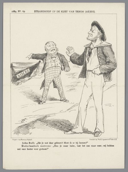 This is a caricature of Bismarck and minister Van Zuylen made in 1867 by Johan Michaël Schmidt Crans, using an unknown medium on paper. It's a Dutch political cartoon, reflecting anxieties about Prussian power in Europe. Schmidt Crans captures the tension between smaller nations, represented here by Van Zuylen, and the growing dominance of Prussia, symbolized by Bismarck. The cartoon speaks volumes about the political climate of the time and how power dynamics played out on the European stage. The imagery used reflects feelings of helplessness in the face of overpowering political forces. This cartoon is a window into the past, inviting us to reflect on how political figures shape the course of history. It evokes complex emotions, from fear and uncertainty to a sense of defiance. It serves as a stark reminder of the human cost of political maneuvering.