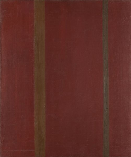 Curator: Here we have Barnett Newman's "Covenant," an oil on canvas completed in 1949, a striking example of Abstract Expressionism currently housed at the Hirshhorn. Editor: Well, it certainly commands attention with that deep, almost blood-red ground. Those two stark vertical lines give it a severity, a kind of visual pronouncement. Curator: Yes, the color choice is certainly potent. It's interesting to note how Newman titled this piece "Covenant," which, of course, suggests a binding agreement or promise. Editor: Exactly. And look at the 'zip' as he called them, those vertical lines. The black one feels like law, stark and unyielding. The golden one though, that shimmers with hope or redemption maybe? Curator: The 'zip' became a signature element of Newman's work. These lines serve as structuring devices, breaking the canvas into zones and inviting the viewer into an immediate and personal encounter. In this context, "Covenant" acquires a weight, reflective of the anxieties around the end of World War II, but the glimmer of that covenant with God is always present. Editor: Right, that context is important. Visually the scale is overwhelming; there's an almost architectural quality here. Does that sense of monumentality suggest something beyond personal struggle – collective memory, perhaps? Curator: Precisely. The large scale emphasizes the direct experience, intending for the viewer to feel enveloped and even dwarfed by it. Editor: So, thinking about imagery and memory, is he inviting a new kind of visual covenant between artwork and viewer? A new, post-war symbolism, using pure form and color. It dispenses the previous figurative norms for accessing deep historical ideas. Curator: That's insightful. I think he's inviting an opportunity to really face existential realities, by rejecting historical motifs. Newman saw the act of painting as an ethical one, one in which abstract art becomes capable of expressing humanity's search for meaning. Editor: It’s an agreement indeed, an agreement that we can, in the face of this bold redness and unwavering lines, still find a connection, still search for promise. Curator: Yes, even when that promise seems obscured, a golden 'zip' of possibility persists.