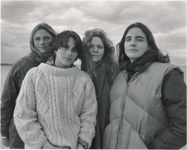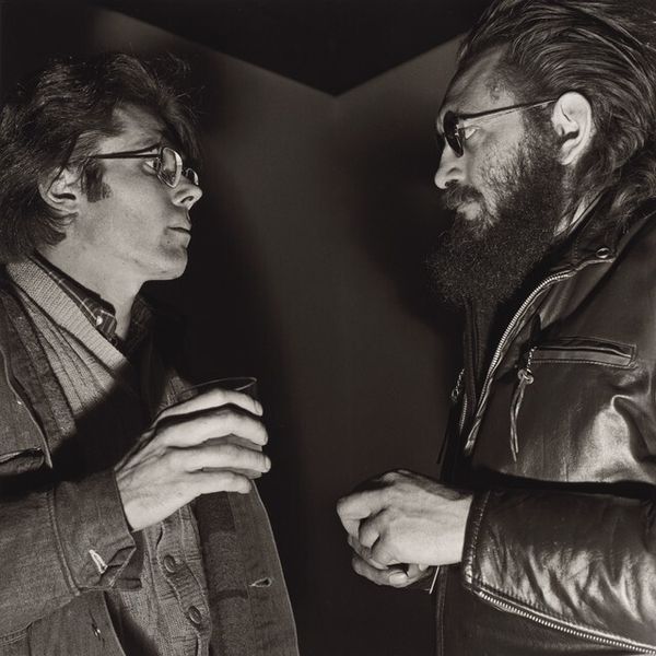 Editor: Rosalind Solomon’s 1987 photograph, "Washington, DC," shows two men sitting casually on the grass. The Washington Monument looms faintly in the background. The black and white format lends the image a timeless quality. I’m struck by their gaze - almost defiant. What symbolic readings can you draw from it? Curator: Indeed, that gaze is powerful. Notice how the Washington Monument, a phallic symbol of national identity and power, is rendered almost insignificant. Consider what that positioning implies when placed behind two men in an era still heavy with the AIDS crisis and societal prejudice. Does the monument serve as a backdrop or something else? Editor: Something else. It almost feels diminished by their presence, overshadowed rather than glorified. Are you suggesting that Solomon is consciously subverting established symbols of authority? Curator: Perhaps. The image plays with layered meanings. The public space, usually associated with civic pride, here becomes a site of quiet assertion. Their relaxed posture is an act of claiming space and normalcy, isn't it? Think of the unspoken narratives, their shared experience versus the dominant narrative projected by the distant monument. It asks us to question who shapes our national iconography. Editor: So the personal becomes overtly political through visual juxtaposition. The Washington Monument loses its intended meaning when filtered through the photographer's and the subjects' lens? Curator: Precisely. It is a potent example of how visual symbols acquire new emotional and cultural significance depending on context and perspective. Editor: I never considered how the power dynamics could shift so dramatically just by changing the background! It’s amazing to think of the image as actively rewriting established visual narratives. Curator: The photograph is an evocative lesson in cultural memory. Remember to ask, “Who is in the frame, who is outside of it, and why does that matter?"