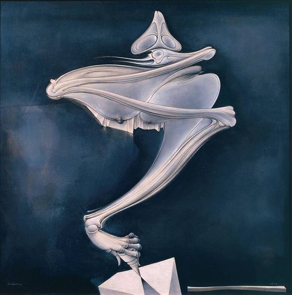 Curator: Welcome. Here, we are looking at Georgia O'Keeffe's "Pelvis II" from 1944, an oil painting. Editor: It's calming. The interplay of the blues and whites is ethereal, like peering into some vast, abstract sky. I can see why people associate O’Keeffe with sensual imagery, the shapes almost echo internal organs, maybe that’s because it is part of a bone. Curator: O’Keeffe's depictions of bones, particularly from the desert landscapes she so loved in New Mexico, emerged during a time when her urban New York environment had begun to feel restrictive. You can understand how they represented an attempt to make larger and more iconic statements with nature, using their abstraction. Editor: So, these weren’t scientific illustrations? Were these large in scale to confront the patriarchy by mirroring images that would otherwise allude to women’s private areas? Curator: Their scale does demand attention. The artist, after an artistic block caused by stress, moved to representing forms more freely. She also created pieces that directly questioned established notions of beauty by drawing from unconventional sources like bones or her landscapes, in a way that mirrored female power in society and celebrated beauty that may otherwise have been forgotten. Editor: These weren't mere pretty pictures; they challenged accepted aesthetic conventions. Seeing bone made so sensuous… that’s subversive. In the context of a male-dominated art world, it’s revolutionary. Did this form influence any architectural details that relate to the home, something traditionally linked to female ownership? Curator: There isn’t a straight architectural connection, however you might compare the sensuous qualities here with designers and craftspeople who emphasize flowing organic details within buildings. Editor: O’Keefe’s artwork, especially today, invites us to consider women artists and how societal and cultural environments restrict how they want to reflect beauty and expression within our everyday lives. Curator: Precisely. And what's beautiful about exploring her work today, is seeing just how enduring that call to re-evaluate perspectives is.