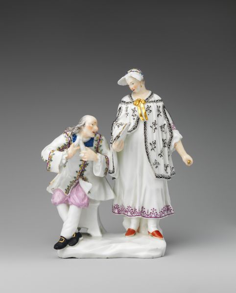 Editor: This striking porcelain sculpture, "Pas de Deux," made around 1755 to 1768 by the Ludwigsburg Porcelain Manufactory, captures a dynamic dancing duo. It’s incredibly detailed. I’m curious about your thoughts on it, what stands out to you? Curator: What interests me most is not just the surface-level elegance, but how its production reflects the social and economic landscape. Porcelain itself, especially during this period, was a luxury good. Its production was highly controlled, a symbol of wealth and power. Considering its materials— where would the Ludwigsburg manufactory have sourced its porcelain, its pigments, and how might labor have been organized to create this work? Editor: That's a great question, I hadn’t thought about where those raw materials would have originated. How does focusing on production change how we interpret the artwork itself? Curator: It invites us to think beyond the aristocratic subject matter and consider the human effort and global networks that made such displays of opulence possible. Did the makers identify with this artwork or where they simply executing commissions? Think about the elaborate costumes – were they simply aesthetic flourishes or did they have some connection with societal hierarchies and values of the time? Editor: I see what you mean. It makes you consider what conditions these artisans worked under to create these luxury objects. This piece becomes not just decorative, but also an indication of wealth distribution in the Rococo Era. Curator: Exactly! And think about where the item was meant to be placed. Understanding where this piece would have lived—a palace display, perhaps?—adds another layer to its meaning. How was porcelain used to demonstrate status and taste within elite circles? Editor: So, rather than just seeing a pretty dancing couple, we're also looking at the story of its making and its place in a broader network of production and consumption. Thank you, that shifted my perception entirely. Curator: Indeed! Material analysis pushes us beyond aesthetic appreciation into deeper socioeconomic insight.