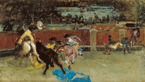 Editor: Sir Alfred Munnings' "Epsom Downs - City and Suburban Day" captures a bustling scene. The caravan feels like a stage, the figures posed just so. What do you see in this snapshot of British life? Curator: The caravan looms large, a potent symbol. For many, it evokes notions of impermanence, freedom, even exclusion. But what about the carefully positioned figures, like actors? What stories do their garments and gestures suggest? Editor: I see hierarchy in the clothes. Some figures are clearly elevated, while others are more humble. Curator: Precisely. Munnings uses clothing as a shorthand for societal strata, triggering recognition and perhaps, reinforcing existing social narratives within the viewer. It's a powerful use of visual symbolism. Editor: I never thought of clothing telling stories that way. Curator: Indeed! The painting serves as a mirror reflecting not just a scene, but also the values and assumptions of the time.