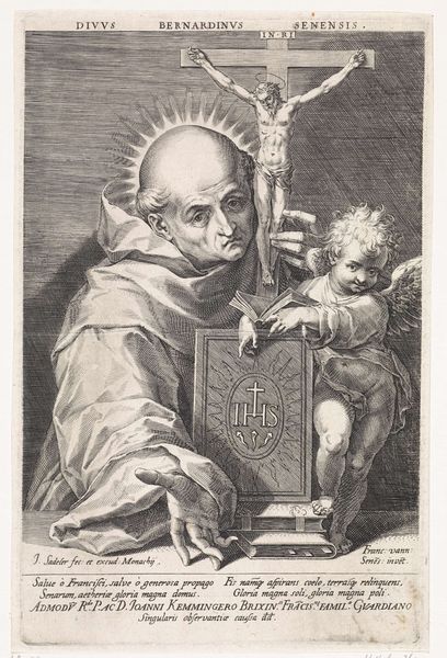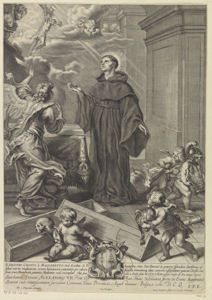 Cornelis Galle I created this print of H. Stanislaus Kostka sometime before 1650. Notice the striking chiaroscuro effect, with light concentrated on the figures of Kostka and the Christ Child, set against a dramatically shadowed background filled with cherubic faces. This contrast isn't merely decorative; it structures the viewer's gaze, directing us to the emotional and spiritual core of the image. The composition employs a visual hierarchy where divine light and cherubic figures look down upon Kostka, who is on his knees. This underscores the sacred nature of the event. The semiotic weight of light here serves as a divine signifier. Galle uses line and form to not just depict a scene, but to evoke a sense of spiritual awakening and divine encounter. Pay close attention to how Galle uses the formal elements of light and shadow. The manipulation of these elements elevates the subject to one of transcendence, inviting the viewer to contemplate the convergence of the earthly and the divine.
