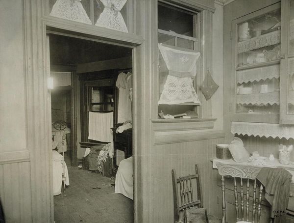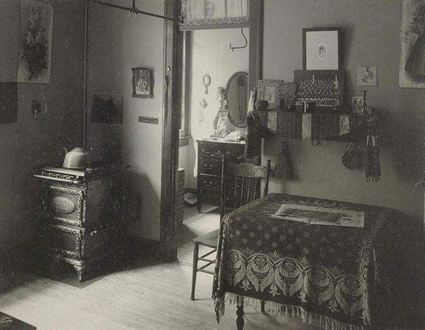 Curator: Jessie Tarbox Beals' photograph, taken in Newark, New Jersey, captures a poignant scene of domestic life, simply titled "Housing Conditions in Newark, New Jersey." It's hauntingly beautiful, don't you think? Editor: Haunting, indeed. Look at the layers of textiles—lace curtains, draped fabrics, the patterned floor. It speaks volumes about resourcefulness and attempts to soften an otherwise stark environment. Curator: Absolutely, there’s a real sense of resilience in the image. The way light struggles to enter hints at both confinement and a quiet dignity. The residents adorned their space with items of beauty; it's as if they're saying, "We are here; we matter." Editor: And the objects themselves—the stove doubling as a table, the decorations, the clock—they become artifacts of daily labor and aspirations. Beals’ work here is a crucial document of urban material culture. Curator: In the end, this photograph feels like a sacred space of personal narrative, a quiet testament to the human spirit amid hardship. Editor: Agreed. And it reminds us that the politics of space are always deeply personal.