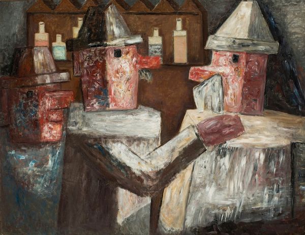 Editor: This is Tadeusz Makowski's "Little Pierrots", painted in 1930 using oil paint. The figures, with their conical hats and blocky forms, give off such a strange and slightly unsettling vibe. What do you make of it? Curator: Ah, Makowski! These aren't your typical cheerful pierrots, are they? There's a beautiful melancholy, almost a solemnity in their geometric faces. For me, it's about the masks we wear, and how even in performance, there's an underlying sense of…something hidden. Does that resonate with you? Editor: Absolutely, the cubist influence gives them an almost alien quality. Like they are peering out from another dimension. Curator: Precisely! It's Makowski using the pierrot archetype, so tied to commedia dell'arte, to explore something deeper. A childlike, even innocent persona but with a twist of…sorrow? Look at the earthy palette, the impasto strokes – there’s a weight to it, isn’t there? Do you feel a story lurking behind those simple shapes? Editor: Definitely a hidden narrative. Almost feels like a comment on societal expectations. These pierrots look constrained somehow. Curator: Constrained, yes! I love that. Makowski was living in France during a period of immense social change. Perhaps the artist saw the pierrot as a symbol of that precarious balance—the tension between outward gaiety and inner turmoil. Makes you think, doesn't it? Editor: It does. I initially found it odd but now I find myself connecting with their subtle emotional weight. Curator: Exactly! Art is like a funhouse mirror reflecting both us and the world back in curious, often poignant ways. I always learn so much discussing art with students!