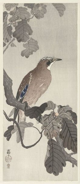 Editor: This woodblock print from 1910 is called "Two Green Peacocks on the Bough of a Flowering Tree" by Ohara Koson. The coloration of the birds' feathers is really striking. How would you interpret the composition of this piece? Curator: Let us begin with the structural elements. Observe the dominant verticality. The composition is distinctly divided into foreground, mid-ground, and background planes, each contributing to the spatial arrangement. The peacocks, meticulously rendered, are situated on the bough, commanding the viewers' attention through their physical size. The application of color also calls for careful examination; note how the verdant plumage and delicate blossoms interact with the muted backdrop, thus creating a play of visual contrasts. What might you say of the shapes and lines used? Editor: I noticed the repetition of circular motifs in the peacock feathers contrasting with the angular branches. It makes the peacocks stand out, almost vibrating against the background. Is that a technique unique to the Ukiyo-e style? Curator: Not necessarily unique, but certainly integral. The graphic simplification, flattened perspective, and bold outlines contribute to a surface-oriented aesthetic that privileges pattern and texture. Semiotically, one might explore how these elements, through their arrangement and interaction, function to produce meanings related to themes of nature, beauty, and artistic representation. How might the textural qualities further affect one's viewing? Editor: I guess I hadn't considered the texture, but you're right – the smooth background makes the peacocks' feathers seem even more detailed. I appreciate how focusing on the individual elements draws out greater appreciation. Curator: Precisely. Through structural examination and decoding, a seemingly simple naturalistic representation yields layers of sophisticated artistic consideration.