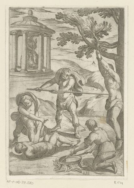 This print, titled "Pan, Pomona en Amor," was created by an anonymous artist. It depicts a complex scene involving mythological figures, a setting that evokes themes of nature, desire, and transformation. At first glance, it appears to be a pastoral fantasy, but the composition reflects broader social attitudes toward gender, sexuality, and power. Pomona, the goddess of fruit trees, stands centrally, while Pan, the god of the wild, sits beside her. Cupid, hovers nearby, adding to the charged atmosphere. The dynamic between these figures asks us to consider questions of consent and desire, framed within the context of classical mythology. The artist’s decision to depict this particular grouping invites reflection on the interactions between humans and the untamed aspects of nature, challenging traditional representations. Ultimately, this print invites us to contemplate the complex intersections of identity, desire, and the narratives we construct around them.