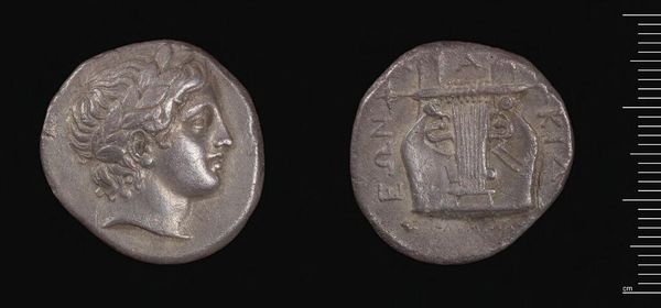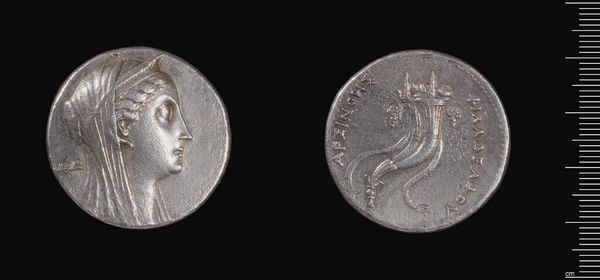 Curator: Here we have an Octadrachm, a mnaieion actually, of Ptolemy VI Philometor. The shine of the gold gives it a sense of permanence. Editor: Absolutely, the luster immediately suggests power and wealth. Who does this image represent, and what does this tell us about Ptolemaic Egypt? Curator: The coin features Arsinoe II. The meticulous engraving, the careful arrangement of her diadem and veil—it all speaks to a rigid adherence to artistic conventions. Editor: Yet, this adherence transmits a crucial message: Ptolemy is drawing a direct line to a deified queen, a powerful female figure. The symbolism of the double cornucopia speaks to the fertility of the land. Curator: Precisely, the composition balances representation with a potent propagandistic tool. Editor: Agreed, this artifact is both a functional object and a declaration of dynastic legitimacy. I now see the image as much more than formal representation. Curator: I concur. Analyzing the artistry and considering the historical context offers a richer understanding. Editor: Indeed.