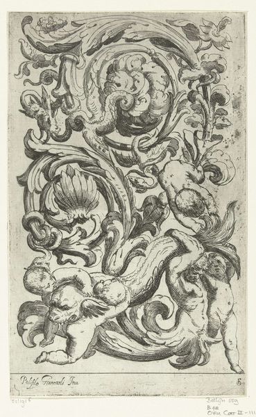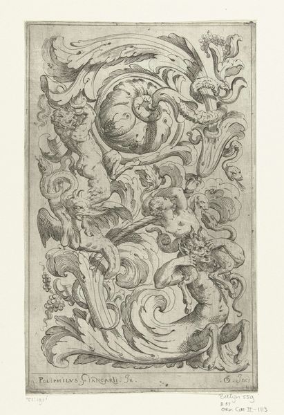 René Lochon made this print, "Verticale dubbele bladrank," sometime in the 17th century. It showcases a symmetrical arrangement of foliage, flowers, and ornamental motifs, rendered with meticulous detail. The composition is structured around a vertical axis, featuring two large floral medallions connected by cascading leaf patterns. The use of line and texture creates a sense of depth and volume, almost as if the design is sculpted in relief. Lochon's formalism is evident in the balanced and harmonious relationship between the different elements. The recurring floral and foliate motifs might act as symbols of growth and vitality. Consider how the print’s vertical orientation creates a sense of upward movement, perhaps suggesting an aspiration towards refinement and aesthetic elevation. This design uses repeated shapes to create visual harmony, but also to suggest the complex interplay between nature and artifice.