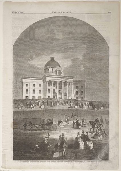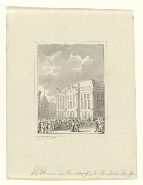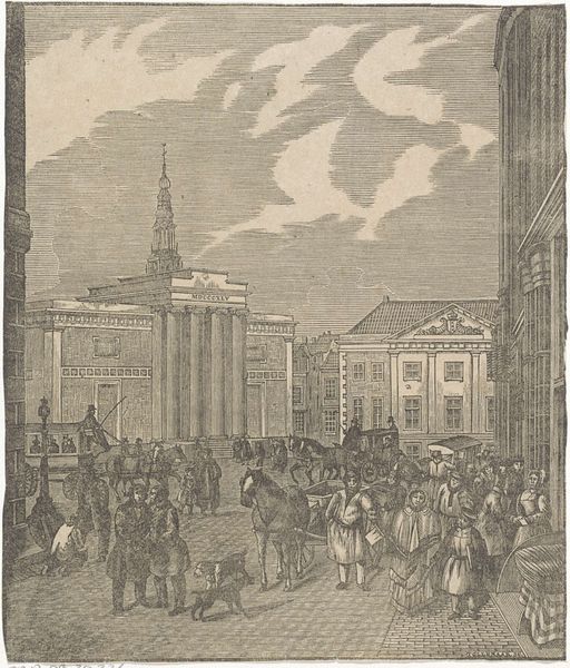 Curator: It’s evocative, isn’t it? A whole bustling city rendered in these fine, feathery lines. There's a kind of melancholy grandeur in that silvery light. Editor: I see an intriguing fragment. This etching, created between 1840 and 1870, is titled “Fragment van een nieuwjaarswens van de Amsterdamse askarrenmannen.” Curator: Right! A New Year’s greeting from the sanitation workers of Amsterdam. Can you imagine getting that on your doorstep? A cityscape wishing you health and prosperity for the coming year, courtesy of the people who kept your streets clean. Editor: What stands out to me is how these public workers employed art as a form of communication. Rather than a simple announcement, they commission art that shapes civic pride, while subtly reinforcing the crucial work they do. It gives them cultural and social agency. Curator: And such lovely lines! Note how the artist uses hatching and cross-hatching to capture all those textures – the cobblestones, the classical architecture, the puffiness of the clouds. It’s almost dreamlike, this dance of shadow and light. Even the tiny dog walking along with its human adds something. Editor: This almost looks like an emerging vision of the modern city in dialogue with the old one. The architecture points toward history while the crowd reflects contemporary commerce. Curator: And who commissioned it! Sanitation workers! To send seasons greetings and remind you they existed! It’s unexpected. Something beautiful produced for a somewhat quotidian reason. I wonder how these “fragments” made their way into the museum? How many have survived? Did everyone put them in the kindling for the fire on January 2nd? Editor: These fragments become invaluable glimpses into past traditions of gift-giving, providing insight into the economy of cultural exchange. The Rijksmuseum has acquired these relics, and displays how a humble print functioned as a message and a social token. Curator: It’s quite wonderful. You know, I find it charming and also quietly revolutionary, the way it elevates these workers through art. To commemorate the efforts of men emptying the city’s chamber pots, on something other than a building, in a building now... Editor: Indeed, art here moves beyond aesthetic object into social document, making this a particularly insightful picture of the role of art and artist. It prompts so many questions about class, work, and civic participation. Curator: What was deemed "important enough" to portray... So it is! So true!