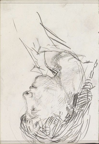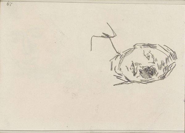 Curator: It strikes me as melancholy, somehow – despite being such a simple sketch. What do you think? Editor: Well, let's start with the basics. This is "Hoofd van een dienstmeid met muts," or "Head of a Maid with a Cap," by Isaac Israels. Though undated, it likely hails from between 1875 and 1934. It's a pencil drawing, currently residing here at the Rijksmuseum. Curator: The angle is so intimate, almost like you're catching a glimpse of someone lost in their thoughts. There's a fleeting quality, and the hat seems enormous compared to the facial expression. I can only speculate, but this portrait makes me want to offer them something to eat! It would almost break the scene of them sitting. Editor: Indeed, the sketchy, almost impressionistic, application of the pencil certainly contributes to that fleeting feeling. Note the economical use of line, defining form with just a few confident strokes. And consider how the artist is exploring texture; see the stark contrast between the plain cap, the hatched area on the cheek and forehead, and then the intricate ruffles. It feels both intimate and deeply observational. It certainly has some features in common with similar work, yet there's always something fresh, wouldn't you agree? Curator: Fresh indeed, it carries that direct, unfiltered feel, like a candid photograph snapped before the subject could pose or become conscious of the photograph! Perhaps it says more about Israels' perception of transient beauty than anything else... It's not an easy kind of art to define or describe. But there it is. Editor: Perhaps the intersection of Realism and Impressionism. He’s presenting her plainly but, at the same time, filtering her presence and character through the mood and technique of his art. Overall, for all of his experience with these genres of painting, it represents a new and original development. Curator: All I know is that looking at this, I feel I understand something unspoken about life and time. The mood is wonderful. It’s the simple things, after all. Editor: A poignant note on which to conclude; thanks for your always refreshing views on the canon.