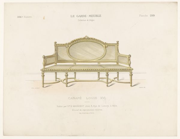 Curator: So, what strikes you first about this print, the “Canapé” from between 1895 and 1935 by Léon Laroche? Editor: It's delicate. It seems to depict a piece of furniture, a sofa, quite elegantly through etching, pen, and other printing techniques. It’s so meticulously rendered; it's almost as if I am looking at a diagram. What stands out to you? Curator: This isn't merely a diagram. Notice the Louis XVI reference in the title. What emotions, what sense of history, do you associate with that era? The sofa becomes a symbol of the aristocratic lifestyle, a representation of power and privilege on the cusp of radical change. Editor: I guess I do associate that style with royalty. The French Revolution ended that period. But here it is printed years later. Why? Curator: Precisely! This is a memory object. It's an exploration of Neoclassicism, and it taps into a longing for an imagined past, even with all the original historical complexity. How does the very *idea* of such a canapé persist culturally? Editor: It’s funny how furniture can represent those concepts. Looking at the image closer, I see recurring motifs of ornamentation – maybe shells and flowers? Do they play a part in this? Curator: Yes. Floral motifs, for instance, represent rebirth and beauty, perhaps a nostalgic nod to simpler, more aesthetic values. Consider what emotional meaning these designs would have held for people familiar with the social upheaval of the late 19th and early 20th centuries, when this print was made. It revives historical meaning through furniture. Editor: I see, a physical reminder of an almost forgotten history and social class. I now appreciate this print much more, thanks! Curator: And now perhaps, we both are ready to seek beauty in history beyond the throne.