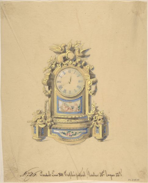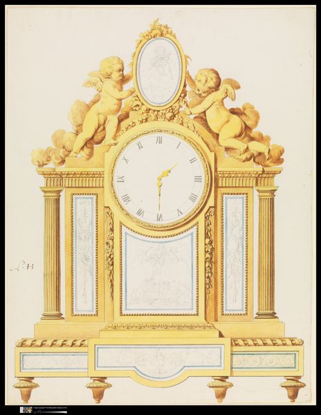 Editor: We're looking at "Ontwerp voor klok met leeuwen en wapen van Amsterdam," a clock design created sometime between 1874 and 1945, by Carel Adolph Lion Cachet. It's a detailed ink and paper drawing. I'm struck by the almost architectural precision, and yet it feels like a fantasy clocktower. What catches your eye? Curator: Well, isn’t it something? It sings of grand ambition, doesn’t it? This clock isn't just about telling time; it’s a statement. Cachet, with that *glorious* name, Lion, suggesting regal…Cachet…evoking, perhaps, an element of mystery, a hidden value. But let's dwell on those lions. I see a yearning for history, perhaps even a slight…irony? Do you see it, the somewhat *forced* heraldry battling the machine age? Editor: Irony? I hadn't considered that. I was too busy getting lost in the detail. All the little patterns… Curator: Patterns within patterns. Lion Cachet, almost ironically, seems to be suggesting a return to craft when industry was about to explode! But tell me, aside from the visual complexity, how does the design *feel* to you? What feelings do you experience? Editor: I see what you mean. There's something a bit melancholic about it now. Almost like a dream of a past that never quite existed, rendered in precise lines. Maybe even a subtle sense of humor in its grandiosity? Curator: Humor perhaps…nostalgia definitely, I see. It’s a beautiful contradiction, this design. And it prompts all sorts of feelings when you start to peel back the layers, no? Editor: Definitely! I'll never look at a clock the same way again! Curator: Nor I. These lines will linger in my mind, dancing with time, memory and heraldry!