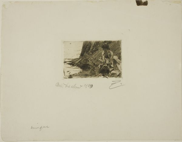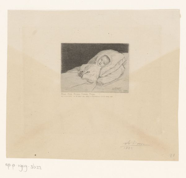 Editor: So, here we have Jean-Louis Forain's 1884 etching, "The Dead Girl," a somber image rendered on paper. The figure is small, almost lost within the blank space. It feels very intimate, yet incredibly distant. What strikes you about this work? Curator: What I find most compelling is the explicit connection between labor and representation. Forain’s choice of etching, a printmaking process reliant on skilled labor and industrial methods of reproduction, immediately reframes this image. We're not just seeing a scene, but also encountering a material process laden with its own social and economic baggage. How does the printmaking technique inform the meaning for you? Editor: That’s a really interesting point. I hadn't considered the act of reproduction itself. Does the choice of etching, a more 'democratic' medium, perhaps speak to the accessibility, or lack thereof, surrounding depictions of death and poverty at the time? Curator: Precisely. Think about who had access to art, to visual narratives. Etching allowed for wider distribution. Considering the time period, do you think this might have been commenting on how certain types of death—like those of impoverished young women—were rendered invisible or commodified in the art market and wider society? Editor: It certainly complicates the idea of romanticizing death. It almost feels like Forain is acknowledging the gritty reality that the process of representing the “dead girl,” even through art, is itself a kind of labor. Curator: Yes, and it forces us to confront the relationship between the artist's labor, the subject’s presumed suffering, and the consumer’s gaze. How does seeing the materials as integral to the message change your understanding of its emotional impact? Editor: It shifts it from simple sentimentality to a sharper social critique, I think. Thanks! Curator: Agreed. Examining the processes, materials, and contexts truly enrich our understanding of what this work is trying to tell us.