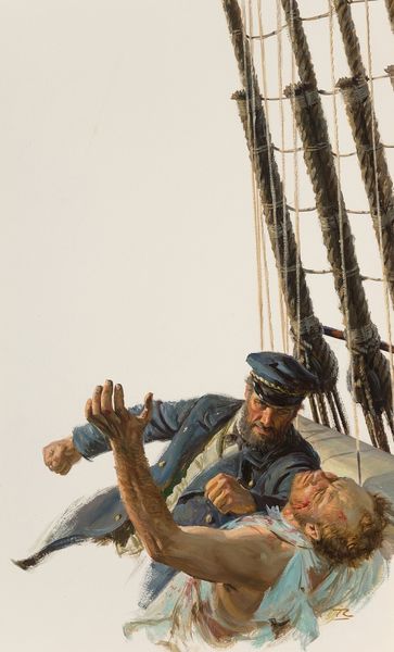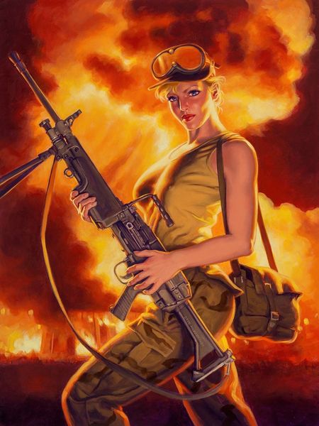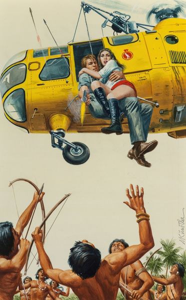 Victor Prezio painted this cover for "Battle Cry" magazine, likely in the mid-20th century, capturing a moment of intense conflict. Note the juxtaposition of destruction and salvation. The U.S. Army helicopter, emblazoned with the star, is under attack, yet it symbolizes rescue amid chaos. The soldier, caught in the crossfire, reaches out in a gesture that speaks of both protection and desperation, echoing the ancient motif of the rescuer found in depictions of saints or mythical heroes. His protective embrace of the woman harks back to classical images of piety, like the Madonna sheltering the faithful. However, here, these symbols are charged with the visceral reality of war. The red star on the attacking planes—a stark contrast to the American emblem—transforms a symbol of hope into a portent of doom. This tension plays on our collective memory, stirring deep-seated fears and anxieties about conflict and survival. It reminds us how symbols evolve, their meanings reshaped by the relentless march of history.