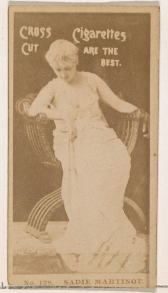 Editor: So this albumen print is called "Miss Rubens," created in 1889 by Wm. S. Kimball & Co. She looks like she's in a vulnerable, almost melancholic pose. What stands out to you about it? Curator: What interests me is how this portrait, seemingly innocuous, operated within the social dynamics of the late 19th century. Cigarette cards like these were immensely popular, often featuring actresses and other women who were both celebrated and objectified. Think about how this image circulated – distributed with cigarettes, primarily consumed by men. What does it mean to commodify a woman’s image in this way? Editor: So you’re saying it's not just a pretty picture; it’s part of a bigger system? Curator: Precisely. It reflects societal attitudes towards women, especially those in the public eye. Their image was used to sell a product, reducing them to a spectacle for the male gaze. This kind of commercialization perpetuates unequal power dynamics. Also, consider the title: "Miss Rubens". Are we invited to compare her physique to that of women painted by Peter Paul Rubens, the famous baroque painter? How do we read her through that reference? Editor: That makes me see it in a different light. It’s more than just a portrait; it's a reflection of how women were perceived and used in advertising at the time. Curator: Exactly! Examining such imagery helps us understand the historical roots of objectification and how these representations continue to shape contemporary perceptions of gender and identity. We should ask, whose story is this photograph really telling, and what power structures are at play? Editor: It's really interesting to consider this as a cultural artifact with embedded social meanings rather than just an image of a woman. Curator: I'm glad it was helpful and provided a better understanding of such artistic and historical significance.