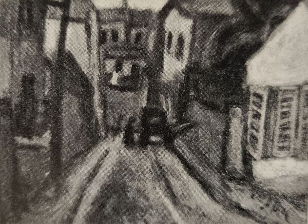 Curator: This charcoal drawing is titled “Roofs of Szentendre” created by Vajda Lajos in 1928. What's your initial take? Editor: Ominous! It feels very top-heavy, a dense accumulation of tones pressing down. I wonder, what informed Vajda Lajos’ somber rendering of this city view? Curator: He often explored semi-abstract cityscapes and landscapes. Note the use of charcoal. See how Lajos utilizes a compressed range of tone in creating this unsettling depiction. Observe the underpainting, those layers and compressed perspectives, which lend a kind of anxious tension to the entire picture. Editor: This work emerged during a period of significant artistic and political upheaval in Europe. This work captures something about the mood in Hungary at that time. Perhaps an industrial-era bleakness settling over a once-picturesque town? I would bet it has everything to do with what this industrial revolution does to this country and it is represented in this work through subject and material. Curator: Interesting point. There’s an evident dissonance created through the angles of the roofs. The composition doesn’t aim for the classical ideals of visual harmony, opting for jagged lines and a palpable sense of unrest instead. It could reflect the internal chaos he may have experienced during a turbulent time. The style tends towards Expressionism; that's the main formal component in reading it. Editor: Right, and Szentendre was something of an artist colony during this interwar period, a haven of creativity but equally, a space rife with ideological tension as the country navigated dramatic political change. How did the socio-economic conditions impact artistic communities such as this one? Curator: An economic decline and pervasive sociopolitical frustrations are key to understanding expressionism. By simplifying forms, such as here with this basic reduction of volumes through tone, there is an expressionistic style rooted in a need to move away from realistic representational depiction to express a mood. Editor: I agree, it acts as a reflection and perhaps critique of a changing Hungarian landscape and the impact this has on lived experience and memory. Curator: By deconstructing forms and employing a monochromatic palette, Lajos captures a moment of the Hungarian experience during that time period. Editor: Absolutely, and I think considering this work within that wider context reveals just how profoundly unsettling it is. It speaks to a shared sense of anxiety experienced within Vajda’s social climate.