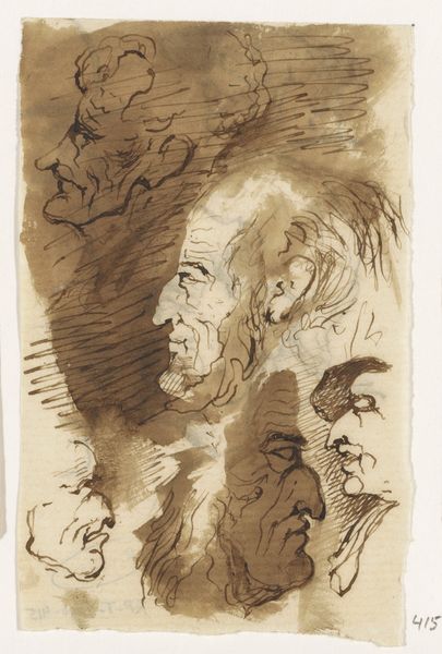 This is ‘Koppen’ a small drawing made with pen in the 19th century by Johannes Tavenraat. Tavenraat lived and worked during a period of significant social change in the Netherlands, with burgeoning industrialization and shifts in class structures. The drawing presents a stark contrast in its depictions of different faces. There is a refined profile at the top, and then below, a grouping of more caricatured visages. This contrast is evocative, prompting us to consider the relationships of power and representation at play in the 19th century. The hierarchy suggested by the placement of these figures—the idealized above the grotesque—speaks volumes about the social biases inherent in portraiture. How might these sketches reflect the artist's own position within the rapidly changing society of his time, and his attitudes toward class and identity? These faces, captured with such starkness and intimacy, offer us a window into the social and cultural values of the past.