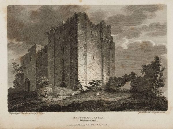 Editor: Here we have Luke Clennell's "Saltwood Castle, Kent." It's a print, and it feels quite imposing, despite its small size. What strikes you most about its composition? Curator: The strategic arrangement of light and shadow models form. Notice the stark contrast defining the castle's facade versus the soft graduation in the clouds. Consider how the engraver's line contributes to the overall texture. Editor: So the texture adds to the dramatic mood? Curator: Precisely. The density and direction of the lines articulate form and evoke a sense of atmospheric perspective, shaping our visual perception of space and mass. What do you make of the figures? Editor: I see. So every detail contributes to the final image and its feel. Thanks, that was helpful! Curator: Indeed. It’s in the convergence of these formal elements that meaning emerges, prompting deeper contemplation.