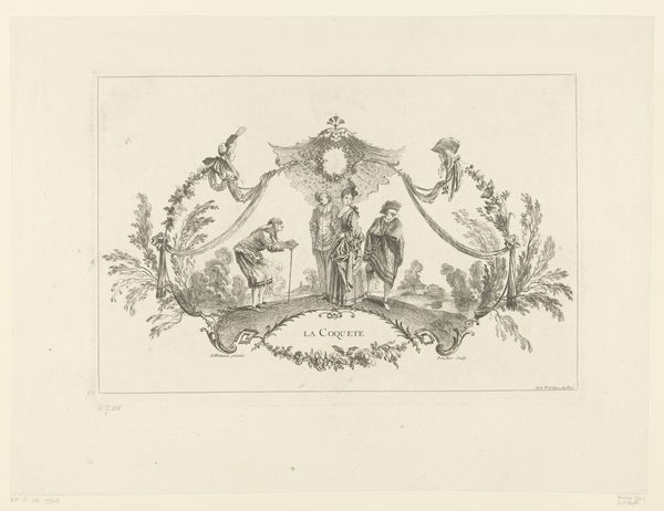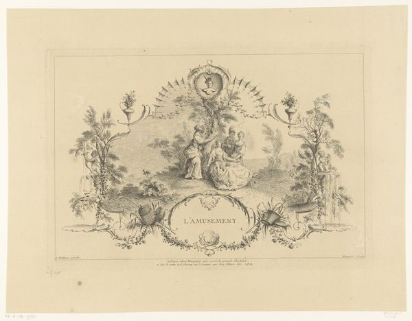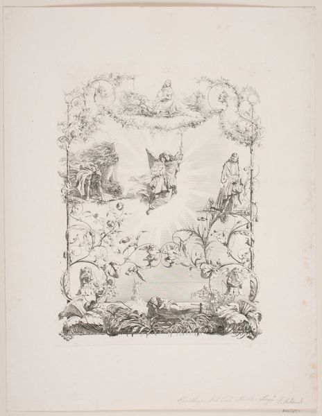 Editor: This is "Ontwerp voor een vignet met een allegorische voorstelling," a drawing in ink by Johannes de Bosch, dating from around 1723-1785. The image is dominated by this central figure with a shield and helmet, encircled by angelic figures. What do you see in this piece? Curator: Well, it's fascinating to see how allegory is used here. We have these classical symbols, right – the helmet, the shield, the angels – all pointing to themes of virtue, protection, perhaps even divine guidance. But I'm more interested in *why* these symbols were chosen, and for *whom*? Who was this message meant to resonate with, and what specific cultural and political anxieties was it addressing? Editor: So you're looking beyond the immediate symbols to their deeper meaning within the time period? Curator: Precisely. Think about the social structures of the 18th century. This wasn't just about "virtue" in a vacuum. Whose virtue are we talking about? Who had access to power and protection, and who was excluded? Look at how the figure is gendered, and consider how that would shape the reading of this allegory. What does a female angel suggest when thinking about ideas around warfare? Editor: That really shifts my perspective. I was just seeing it as a decorative piece. Curator: Decoration served a purpose! It was a visual language, reinforcing particular values and hierarchies. We can think about it as visual propaganda. Editor: That makes sense. It's less about the beautiful drawing and more about the power structures it represents. Thanks, I am really seeing this in a totally new way now. Curator: Exactly, and once we start asking those questions, we can uncover hidden narratives embedded within the art of the time.