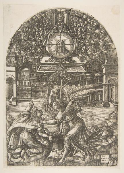 Jean Duvet's engraving, The Angel Shows Saint John the New Jerusalem, presents a dense, intricately worked composition of figures and architecture. The artist has employed a limited range of tonal values which gives the image a tapestry-like visual quality. Duvet's handling of the composition, with its interplay of foreground and background, is of particular interest. Saint John and the angel occupy the lower portion of the image, their forms delineated with complex networks of lines that define the folds of their drapery and anatomical details. Above them, the New Jerusalem unfolds, a vision of towering structures rendered with obsessive precision. This juxtaposition creates a layered effect, inviting us to contemplate the relationship between the earthly and the divine. The engraving technique itself becomes a means of philosophical inquiry, questioning established notions of representation and meaning. The complexity of the line work resists easy interpretation, suggesting the mysterious and multifaceted nature of religious experience.