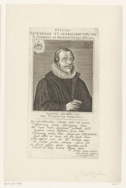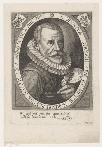 Editor: Here we have "Portret van Balthasar Caimox op 52-jarige leeftijd," made sometime between 1613 and 1635. It’s an engraving. The detail is incredible, especially around his face and ruff. What stands out to you in this portrait? Curator: What immediately strikes me is the inscription surrounding Caimox. How does this text, along with his rather intense gaze, position him within the societal framework of his time? He looks confident, perhaps even challenging. I wonder what statements this portrait makes about wealth, class and identity of early 17th century merchants? Editor: So the text isn't just decorative? How would that connect with his class? Curator: Absolutely not! These weren't just names and dates. The meticulous inclusion of details – his age, his city – underscores the importance of identity and lineage in a rapidly changing society. It's a calculated construction of persona, deeply rooted in the anxieties and aspirations of a rising merchant class eager to establish its place within the social hierarchy. Is his apparent confidence masking any tensions? Editor: That’s a completely different way of seeing it! I was focusing on the technique but missing the bigger picture about identity and society. Curator: And what do you think of the clothing, and that elaborate ruff around his neck? Editor: Now that you point it out, the ruff seems like such a status symbol. Perhaps there is more to it. It adds to the impression of importance. Thanks for pointing that out! Curator: Of course. Think of it as a language; his entire image is speaking volumes. Every element works together to tell his story. The challenge, of course, is deciphering it within its specific socio-historical moment.