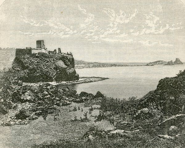 This is a photograph called Fort Dumplings, captured by James Wallace Black. Perched atop a rocky hill, the fort stands as a potent symbol of defense and power. Its circular form echoes ancient watchtowers and citadels found across civilizations, from the Roman castra to medieval keeps, embodying humanity's primal need for security. The placement of the fort, overlooking the sea, is not accidental. It evokes a timeless narrative of vigilance against external threats. This image resonates with earlier representations of fortifications in art, such as those in Renaissance paintings, where castles often symbolize strength. Consider the psychological dimension: the fort represents an attempt to control the unknown, to create order from chaos. The collective memory of sieges, battles, and the struggle for survival is embedded in this image. The structure's solidity projects an illusion of permanence against the inevitable tide of history. The fort's presence is cyclical, each iteration carrying echoes of past defenses, adapted for new conflicts.
