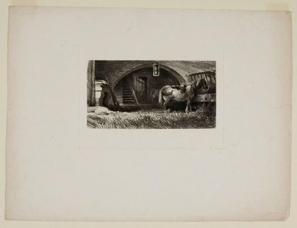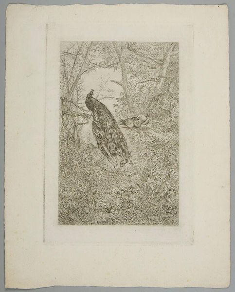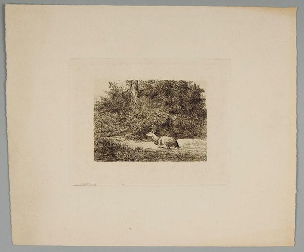 Curator: Here we have Karl Bodmer's "Fox Returning to Its Den," a charming print housed at the Harvard Art Museums. Editor: My first impression is of a hidden world, a secret glimpse into the fox's quiet, watchful life. The tight composition feels intimate. Curator: Bodmer, known for his depictions of the American West, captures the fox here with a European sensibility. Notice how this animal becomes part of this thicket, nearly one with its surroundings. Editor: The fox is a potent symbol, often associated with cunning, but also with domesticity and family. I see a return, a seeking of safety within a familiar space, a need for belonging. Curator: Indeed. The fox held different meanings for different indigenous groups. This image, though, seems deliberately detached from specific cultural narratives, allowing for broader readings. Editor: So, what does this image tell us about the representation of wilderness in 19th-century art? Curator: I think it demonstrates the human need to find narratives even in the seemingly untouched natural world, and how those narratives change as they travel between cultures. Editor: It’s a reminder of the powerful narratives embedded in even the most unassuming images.