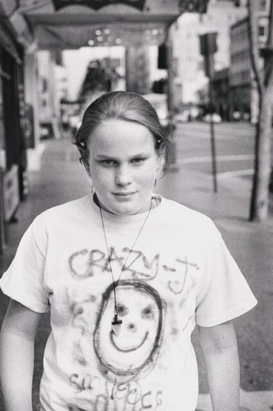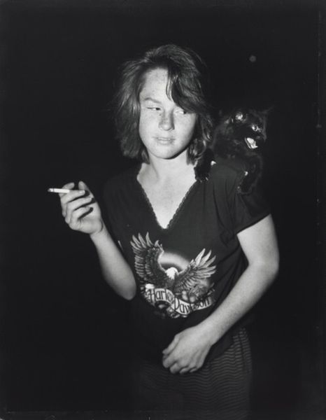 Editor: Jim Goldberg’s black and white photograph, "Macki with Red Rose," made sometime between 1989 and 1994, has a cool yet melancholy feel. The young person's gaze is so intense and it draws me in! What is your take on this, what do you see in it? Curator: Oh, this piece speaks volumes to me! I see a challenge to the traditional romanticism of the rose. Here, in Goldberg's lens, it's less a symbol of effortless beauty and more… complicated. The direct stare combined with the rose, slightly faded maybe? Suggests a confrontation, doesn't it? Like a thorny love story in the making. What do you feel about the setting of a photograph as portrait? Does that inform the photo or simply situate it in place? Editor: The urban background does add to the tension, I think. It's like beauty juxtaposed against…reality? A sort of Romeo and Juliet vibe. Did the use of black and white affect its meaning? Curator: Absolutely. Stripping away the color puts the emphasis squarely on form, texture, and that unwavering gaze. It also evokes a timeless quality, doesn't it? Almost like a memory fading in and out. Do you notice the slightly grainy quality of the print? This is part of its narrative for me as it references a lived life with complexity and imperfections. Editor: So, it’s like Goldberg is using the rose and the black and white to make a statement, a sort of challenge to classical beauty. Curator: Precisely! It invites us to question easy assumptions and look for the complexities beneath the surface. Don't you find that exciting? Editor: Totally! It’s shown me to expect the unexpected in art and its narrative! Curator: And isn't that the most rewarding part? Keep looking, keep questioning!