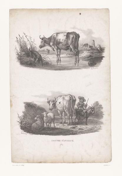 Arie Ketting de Koningh made this 'Landschap met stieren' drawing, or Landscape with Bulls, using pen and gray ink. The pastoral scene is immediately striking for its ordered arrangement of elements, a feature that guides the viewer's eye across the composition. Two bulls dominate the foreground, each rendered with careful attention to texture and form. The standing bull on the left has a powerful presence, its stance firm and unyielding, while its companion rests, creating a contrast between alertness and repose. Behind them, the landscape unfolds with a gentle rise, leading to a distant horizon. Trees are placed on either side of the bulls, framing the composition, but also giving it an air of enclosure. The drawing’s success lies in its ability to harmonize contrasting states of being within a singular pictorial space. The formal qualities of the artwork, particularly its balanced composition, invite us to consider how such subtle arrangements can reflect and shape our understanding of nature.