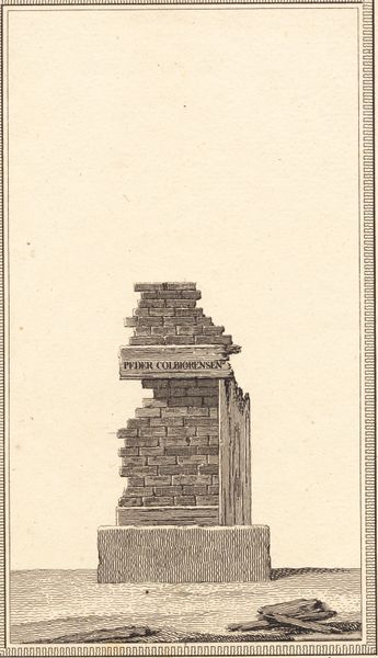Curator: This etching, made by J.F. Clemens between 1779 and 1781, is a portrait of Hans Tavsen, a key figure in the Danish Reformation. The work, currently held at the SMK - Statens Museum for Kunst, immediately brings to mind... well, what jumps out at you? Editor: Stone. Seriously. A stone stele, kind of…severe? Is it meant to be austere, this depiction of Tavsen? There’s this odd blankness around it that makes it feel like it is floating. Curator: Floating is an interesting way to put it. Perhaps the starkness emphasizes the importance of Tavsen's legacy, the enduring nature of his reforms, the solidity of scripture, literally, resting upon a solid foundation. See how the book anchors it all? It’s almost monumental. Editor: Yes, I notice the book is prominently placed; It feels like it might fall over at any moment, propped up as it is, giving a precariousness to his message. And while a stone monument would be a symbol of enduring strength, doesn't it all feel slightly...funereal? Curator: Perhaps, but a funerary monument isn’t only about loss; it's also a statement about remembrance, the ongoing presence of the deceased in cultural memory. Consider the open book: knowledge, wisdom, ideas liberated. Hans Tavsen was influential in translating the Bible into Danish, thus his teachings have become accessible and widely known. It is meant to feel grounded in legacy. Editor: I can see that reading. Still, I feel something unsettling in the air...or rather, in the negative space. All that…emptiness...it leaves too much room to think! But the border has an architectural ornamentation, giving the piece a grounded sense of belonging within an institution. Curator: Precisely. The border reaffirms that this is more than just a somber depiction. It's framed within an established tradition, almost as an important symbol. Editor: The engraving work is meticulous and delicate, however the image for me conveys a much weightier importance. Curator: And therein lies the beauty, doesn't it? It asks us to consider legacy and faith, how we memorialize figures that change our world. Editor: Yes, indeed. A thoughtful—if somewhat haunting—piece.