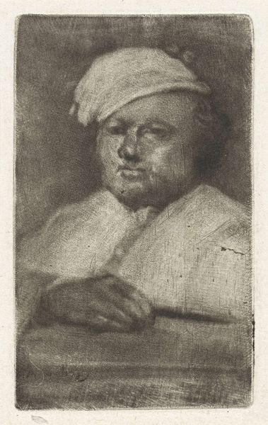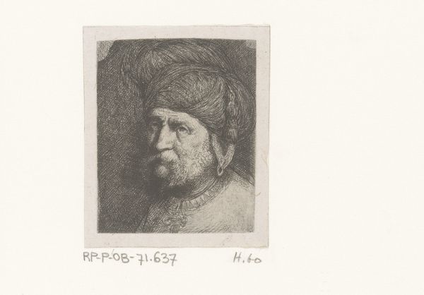 Curator: This etching, dating back to 1784, is titled "Man met hoge muts wijzend op papier," or "Man with tall hat pointing to paper," by Jean-Pierre Norblin de la Gourdaine. Editor: It’s quite striking! He seems lost in thought, or perhaps he's making a critical decision, judging by that finger pointing at the document. There is a sense of weight to the image, of pondering and considering. Curator: I see a convergence of social roles here. You know, the act of pointing suggests authority, judgment even, yet the medium itself, the etching, brings a level of democratisation to image-making. Printmaking made images like these more accessible during that period. It takes it away from a simple portrayal of social status to making it an available commodity for wider circles. Editor: I agree. The crosshatching technique gives this a raw, almost unfinished quality that invites you closer to the process. It really highlights labor. There is so much detail! Think of the manual skill it would take to cut lines like that to the plate with burin. It brings the maker close to us. And he is clearly wearing his best furs...it gives this so much context about social layers and production. Curator: And look at the hat. It is massive, giving an eccentric, theatrical air to this man. One might say it symbolizes a certain level of ambition. He stands before us, not in serene neoclassical composure, but full of life! There’s an energy to him, like he could at any moment, jump from the paper. I can almost hear his thoughts about paper and pen. Editor: True! And given the French Revolution was just around the corner, it really gives me chills when I consider that this etching represents more than a single man – but hints at the complex socio-political web that influenced everyone, including the artist, in the late 18th century. Curator: Indeed, from a seemingly simple portrait to such expansive themes! A nice note to reflect on what we make of art in retrospect. Editor: Exactly. Art as material and reflection! It's such an act of recording social status, while also changing the way it is done by distributing this through reproducible print form.