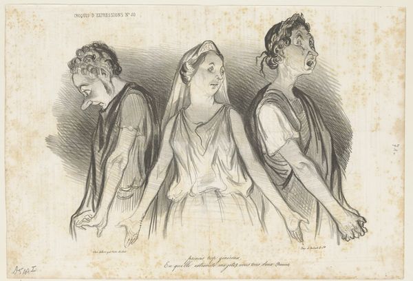 Editor: This is Honoré Daumier’s lithograph, "Charming...trailing all the hearts after him...". I’m struck by the sharp lines and how they seem to satirize the figures. What do you see in the materiality of this work? Curator: Consider the mass production of lithographs in 19th century France. Daumier used this accessible medium to critique social elites, challenging the traditional role of art as a luxury object. How does the printmaking process inform the work's commentary? Editor: So, it’s not just the image, but the medium itself that delivers the message? Curator: Precisely. The very nature of lithography, its affordability and reproducibility, democratized art and enabled Daumier to reach a broad audience with his social critique. Editor: That's fascinating. I didn't consider the social context of the materials before. Thanks! Curator: It’s crucial to understanding the full impact of Daumier’s work.