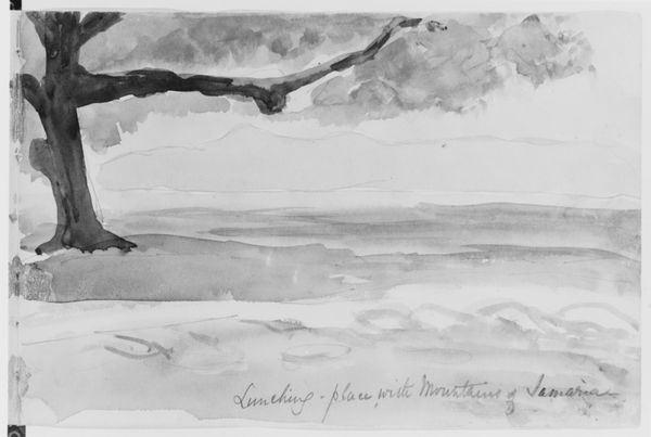 Editor: Here we have Hercules Brabazon Brabazon's watercolor, "Rhodes". It's fairly small, and the monochromatic palette gives it a somber, almost ghost-like feeling. What can you tell me about the social context of this work? Curator: Well, "Rhodes," like much of Brabazon's work, hints at the late 19th-century fascination with travel and the picturesque. But consider, who had access to these views? The art market catered to a privileged class, reinforcing a specific vision of the world, one often romanticized and devoid of local realities. Editor: So, even a seemingly simple landscape carries a weight of social implications? Curator: Precisely. It's not just a pretty picture; it's a window into a particular moment in history and the power dynamics at play within artistic representation. What do you make of that large pillar in the foreground? Editor: It seems oddly placed and somewhat imposing. It makes me think about the weight of the past, the structures of power... Curator: Exactly. Brabazon is using this relic to frame our view of Rhodes, perhaps inviting viewers to consider the layers of history and influence embedded in the landscape. Editor: I didn't realize how much historical context could be packed into a landscape. Thanks for helping me see this in a new light!