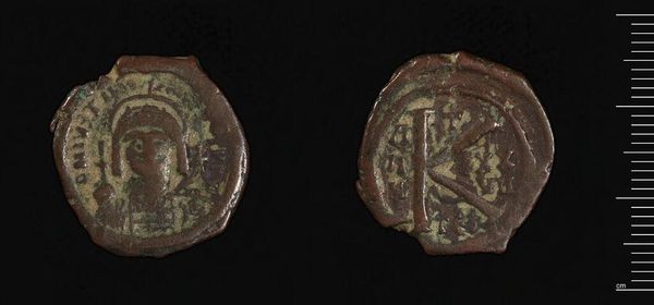 Curator: Here we have a coin of Constans II, held in the Harvard Art Museums. Editor: It's incredible how something so small can feel so weighty. I’m immediately drawn to the weathered texture and the muted palette; it speaks of history etched into the very material. Curator: Absolutely. The imagery—Constans II on one side, likely a royal symbol on the other—speaks to the emperor’s power and the visual language of the Byzantine Empire. Coins were potent symbols of authority. Editor: The images look almost crude, and primitive, yet the lines are so sharp and clear. I wonder about the original intention, or the process of its creation. Curator: Coins served as propaganda, reinforcing the emperor's image and legitimacy. Each detail was carefully chosen for its symbolic resonance. Editor: To think of what these two sides might have witnessed. From commerce, to wars, to burials, and migrations. Curator: The past is captured in miniature right here. Editor: A portal.