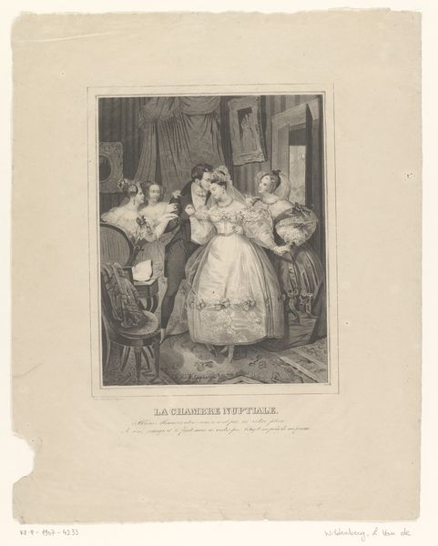 Editor: Here we have a reproduction of a drawing by Wilhelm von Kaulbach, sometime between 1850 and 1900. It’s based on Goethe’s "Die Natürliche Tochter," featuring Eugénie. It’s an engraving and feels very much of the Romantic era... all drama and veiled emotions. What can you tell me about its place within its own time? Curator: It’s interesting to consider the relationship between Kaulbach, Goethe’s play, and the broader context of 19th-century Germany. Reproductions like this made art accessible, fostering a shared cultural understanding, but also solidifying specific interpretations of literary works. What sort of power do you see in disseminating imagery linked to national identity and ideals, especially in a fragmented Germany searching for unification? Editor: So it's more than just illustrating a play; it's about building a shared cultural understanding. I guess by distributing it widely they tried to enforce it on the German population? It also looks like some older painting was put into a picture on the background, how does this intertwine in the story? Curator: Precisely! Consider the role of art academies, printmaking, and even museum collections in shaping and controlling visual culture. They reinforced certain artistic styles and historical narratives. And notice how this print seeks to validate the story not just through textual reference, but by embedding it in the visual language of "high art," referencing older painting. To what extent does that background portrait, that symbol of historical legitimacy, shape how we perceive Eugénie’s story? Editor: So the art itself is reinforcing the legitimacy of the story it tells. It's interesting to consider the role of reproduction in either democratizing art or... enforcing a particular cultural view. Thanks for pointing that out! Curator: Exactly! Reflecting on how the image functions socially reveals much about the power dynamics of the period, even beyond the immediate subject matter.