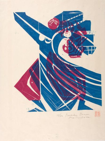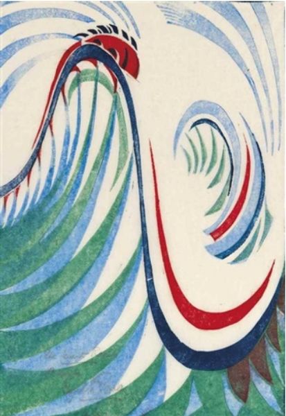 Claude Flight made this linocut, called Street Singers, in the early 20th century. It’s all about rhythm and movement. See how the colors vibrate, like a jazzy tune? Flight uses simple shapes and bold colors to create a sense of energy, like the musicians are really belting out a song. The way the ink sits on the paper, it’s almost sculptural. Look at the black lines forming the figures and instruments. They’re not just lines, they're little canyons, catching the light and casting tiny shadows. It's not a smooth surface; you can almost feel the texture of the block, and the pressure of the press. It's like the print is alive, humming with the vibrations of the city. This print reminds me of some of Sonia Delaunay's abstract compositions, with their bold shapes and vibrant colours. But where Delaunay is all about pure abstraction, Flight brings in the human element, the everyday energy of the street. It's a beautiful example of how art can capture the feeling of a moment, the sound of a place, without being strictly representational.