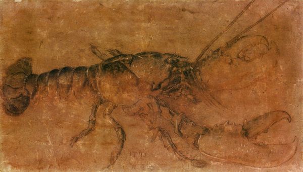 Curator: This is "Crawfish" by Katsushika Hokusai, the famed Japanese artist, now residing at the Harvard Art Museums. I find it striking. Editor: Yes, the intense, almost tactile rendering of the shell! It gives the crawfish a monumentality, a powerful presence despite its actual size. Curator: Hokusai's mastery of line and form is evident in how he conveys texture. The use of woodblock printing allowed these images to be reproduced, democratizing access to art. Editor: Certainly, the act of mass production changes the image's value and consumption. It becomes both art and commodity in society. Curator: Precisely. It also served educational purposes. Prints like these were circulated widely, revealing much about the natural world and societal appreciation for natural forms. Editor: I see the crawfish, then, as both a depiction of nature and an artifact of its time, shaped by the cultural forces of production and distribution. Curator: A fitting conclusion. It highlights the multifaceted nature of art. Editor: Indeed, something to think about.