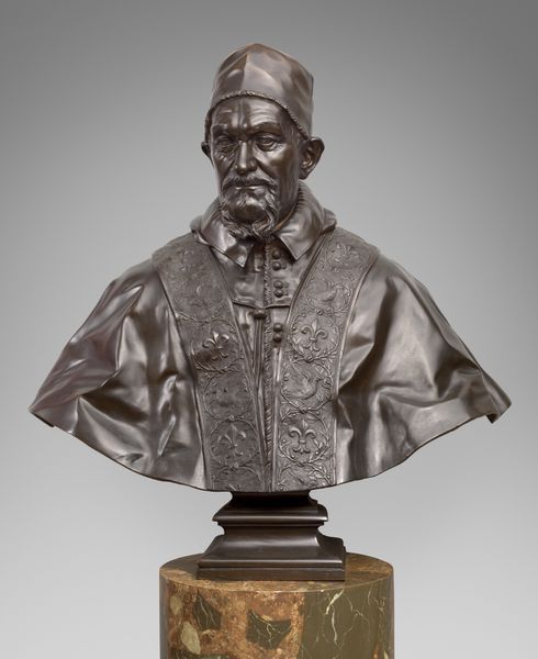 This is a bronze portrait bust of Pope Clement X, crafted by an anonymous artist. The most striking symbols are the papal tiara and keys, prominently displayed on his vestments. These are not mere decorations; they are potent emblems of papal authority. The tiara, a tri-coroneted crown, represents the Pope's threefold power as father of princes and kings, ruler of the world, and vicar of Christ. The keys, echoing Saint Peter, symbolize the power to bind and loose, to forgive sins and open the gates of Heaven. Consider how the image of keys, a symbol of authority, stretches back to ancient Roman depictions of Janus, the god of doorways and beginnings. The baton, not represented here, appears in ancient Greek sculpture, symbolizing power and order. These objects resurface across time, evolving and adapting in meaning, yet always retaining a core association with control and dominion. This portrait is not merely a depiction of Clement X; it's a manifestation of enduring symbols of power that resonate through the ages.