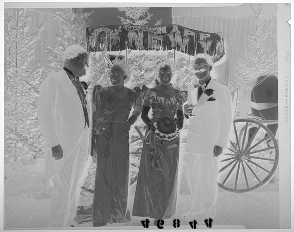 Editor: This is an intriguing photograph by Martin Schweig, titled "Untitled (young woman and middle aged man holding large pretzel gift at New Year's party)." The inverted tones create an unusual effect. What strikes you most about the composition? Curator: The strong diagonal created by the pretzel dominates the frame. Notice how the lines of the surrounding architecture—the archway, the implied ceiling—intersect to create a structured space. Do you see how the figures are carefully positioned within this geometry? Editor: Yes, the figures seem almost secondary to the formal arrangement. Curator: Precisely. The photograph prioritizes the visual relationships between shapes and forms, rather than narrative. The inversion further abstracts the image, pushing us to consider pure form. What do you make of that? Editor: I appreciate the emphasis on visual relationships. It's a refreshing perspective on a seemingly straightforward scene.